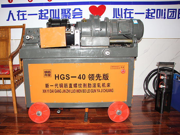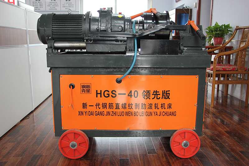 HGS-40型鋼筋直螺紋滾絲機:由機架、夾緊鉗、導軌、滑套、擺線針輪減速機、剝肋滾軋頭、進給機構、自動開合機構、行程限位機構、冷卻系統(tǒng)、電器控制箱、控制系統(tǒng)等部分組成。